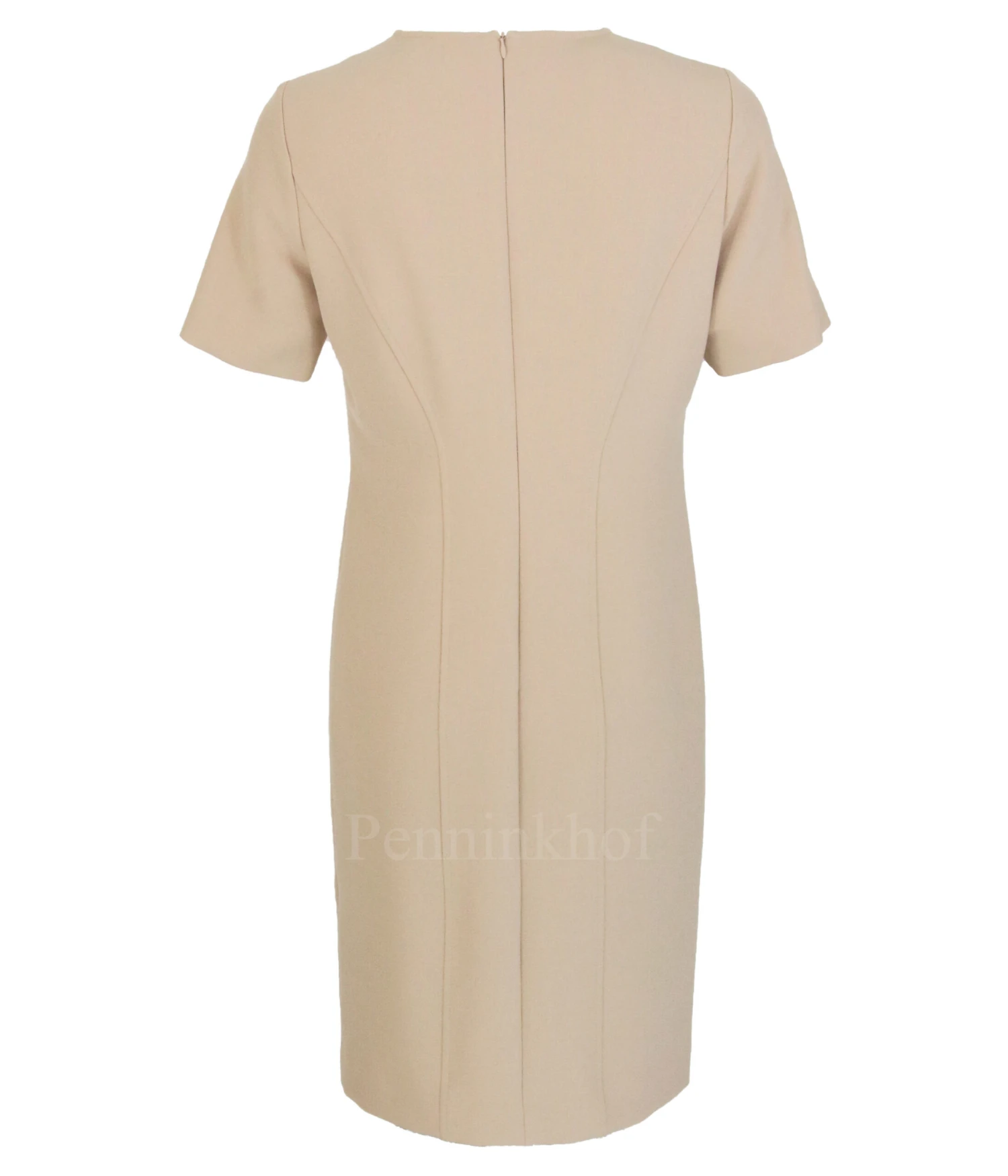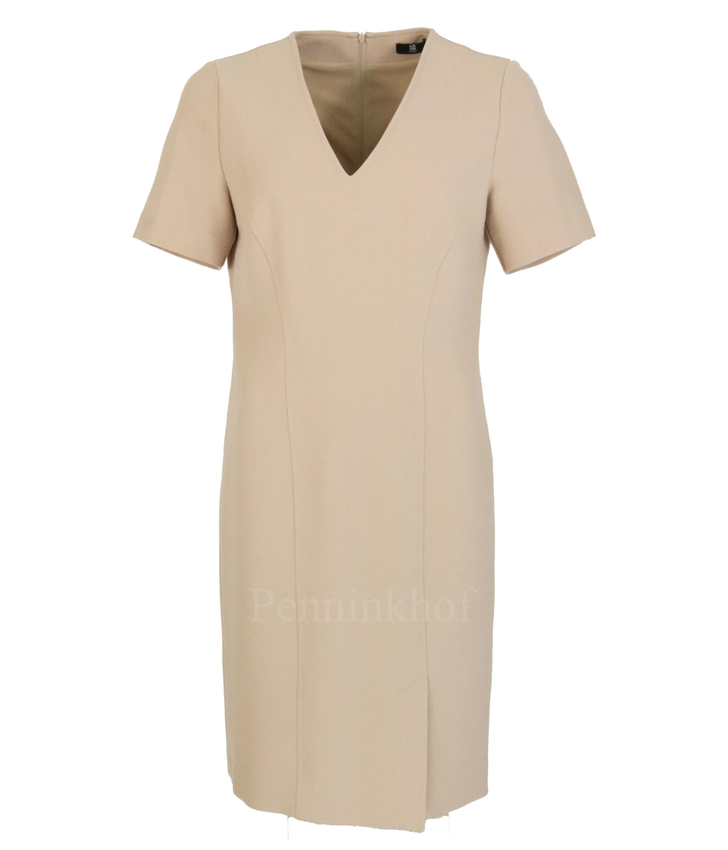Een jurk van Riani in een volle zandkleur. De jurk heeft een V – Hals en heeft korte mouwen. Aan de onderkant is aan de voorzijde, links van het midden een korte split. De jurk is gevoerd en mag niet worden gewassen.
