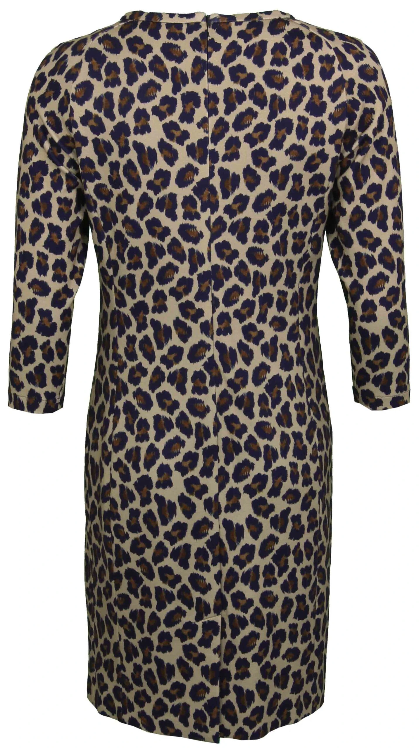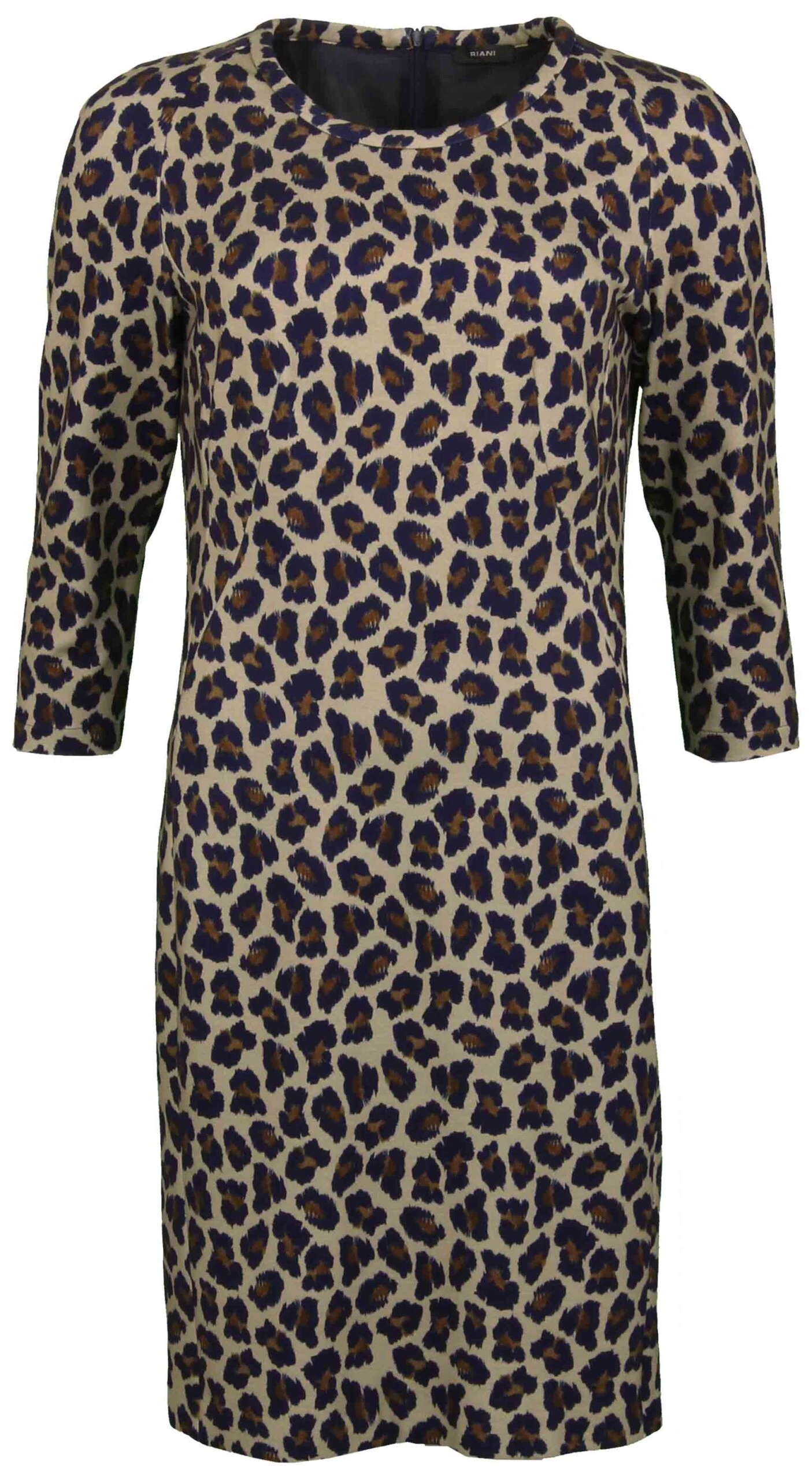 Een jurk van het merk Riani in een panterprint met de kleuren marine blauw, taupe en cognac. De jurk heeft een ronde hals en halflange mouwen. De jurk is gevoerd en mag niet worden gewassen.