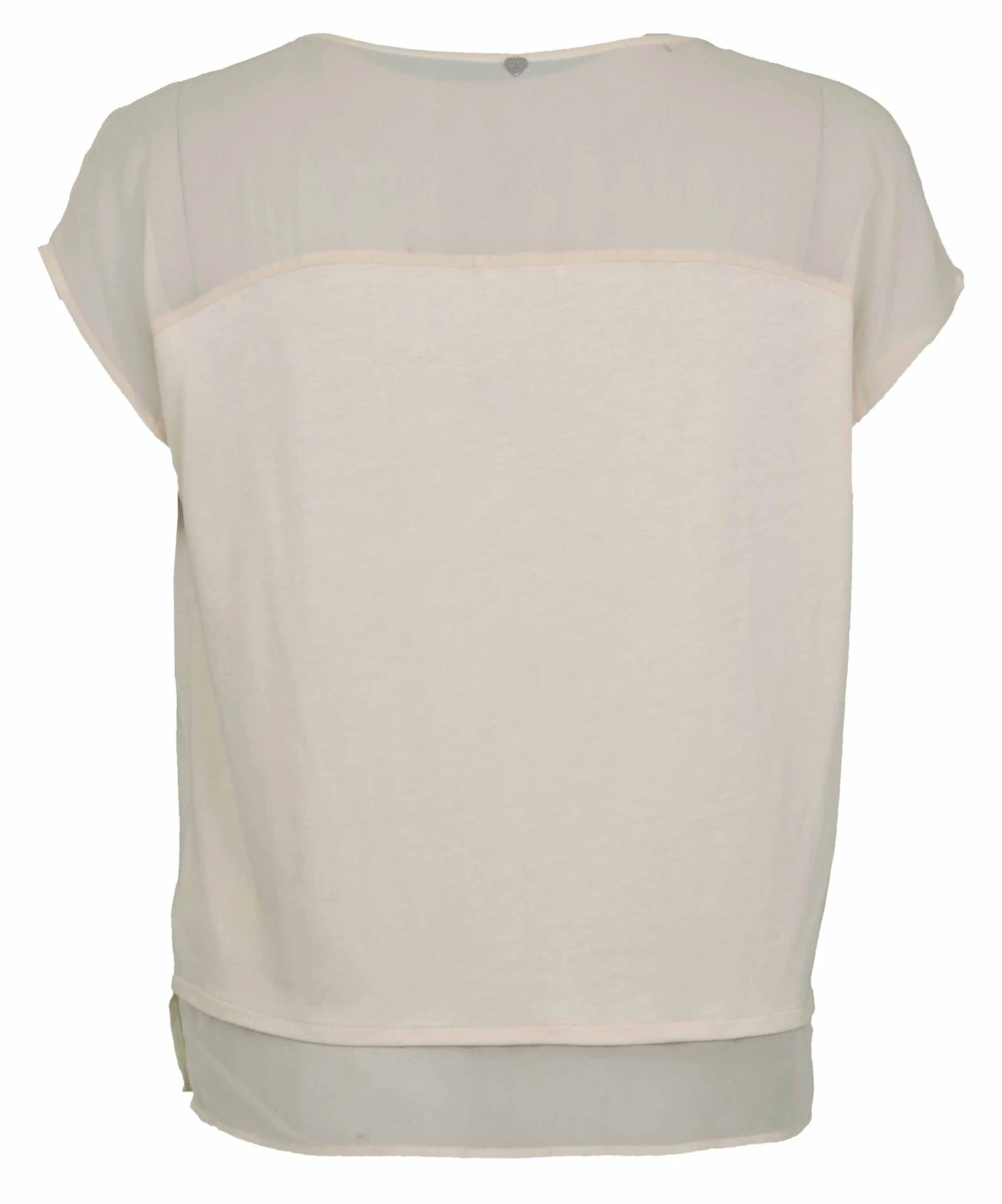 Een top van Riani in een zand kleur. Boven de buste is de top transparant. De ronde hals heeft in het midden een kleine uitsnijding. Aan de onderzijde is een voile boord. Deze top mag op de hand worden gewassen.