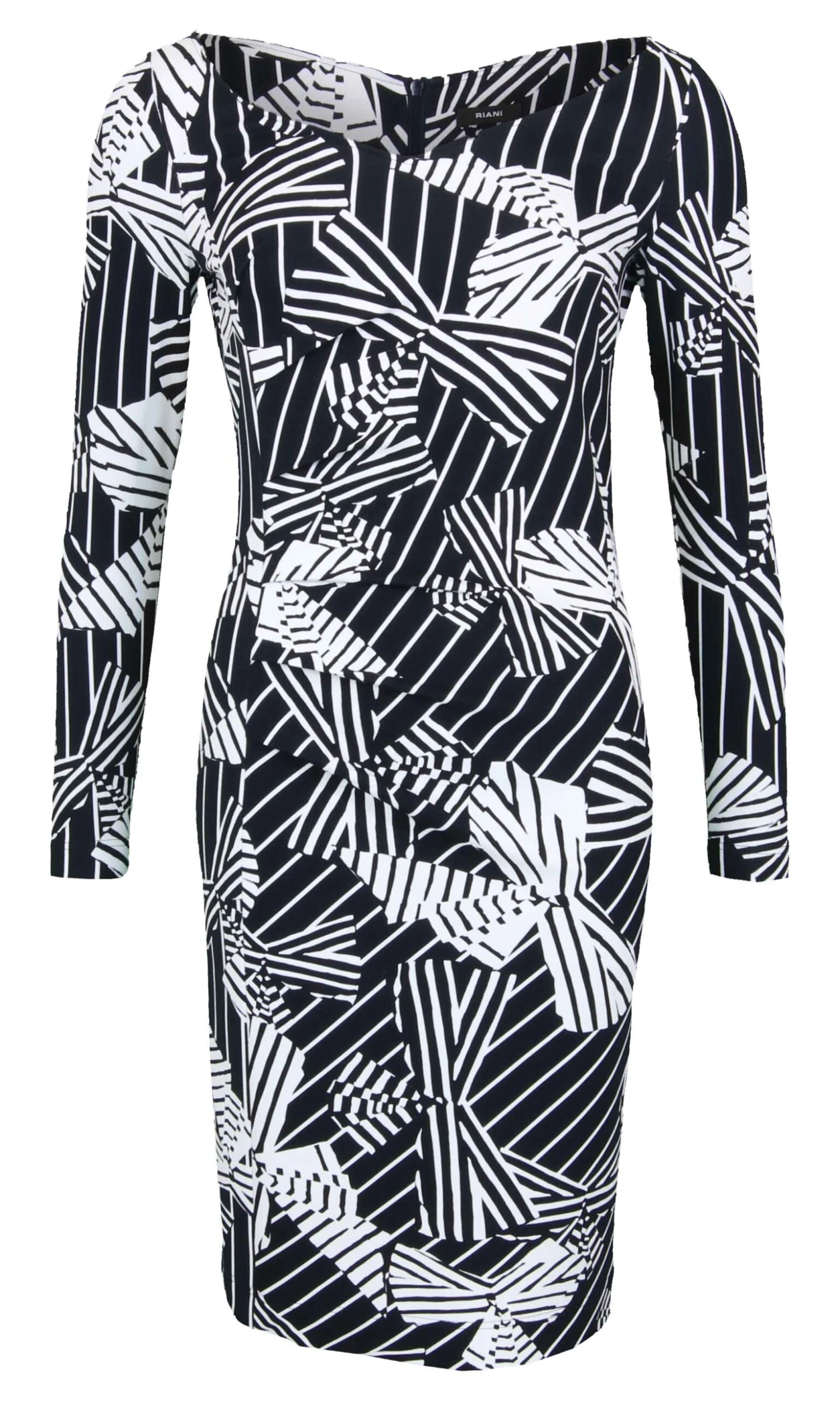 Een jurk van Riani in een grafische print van strikken in de kleuren marine blauw met wit. Aan de rechter zijkant zijn ter hoogte van de taille meerdere plooien wat een drapeer effect geeft. De jurk heef een rond lopende V – Hals en mag niet worden gewassen.