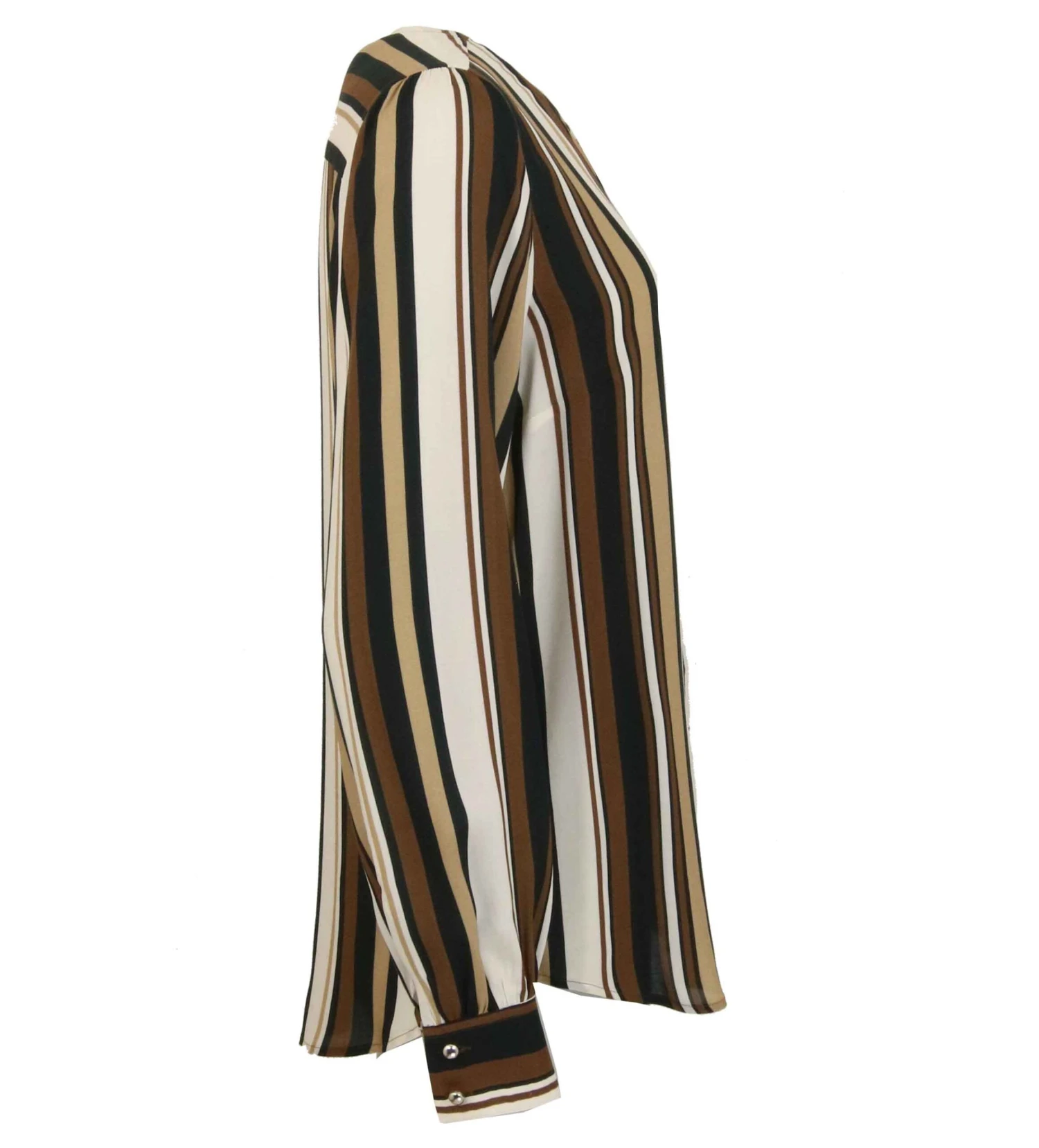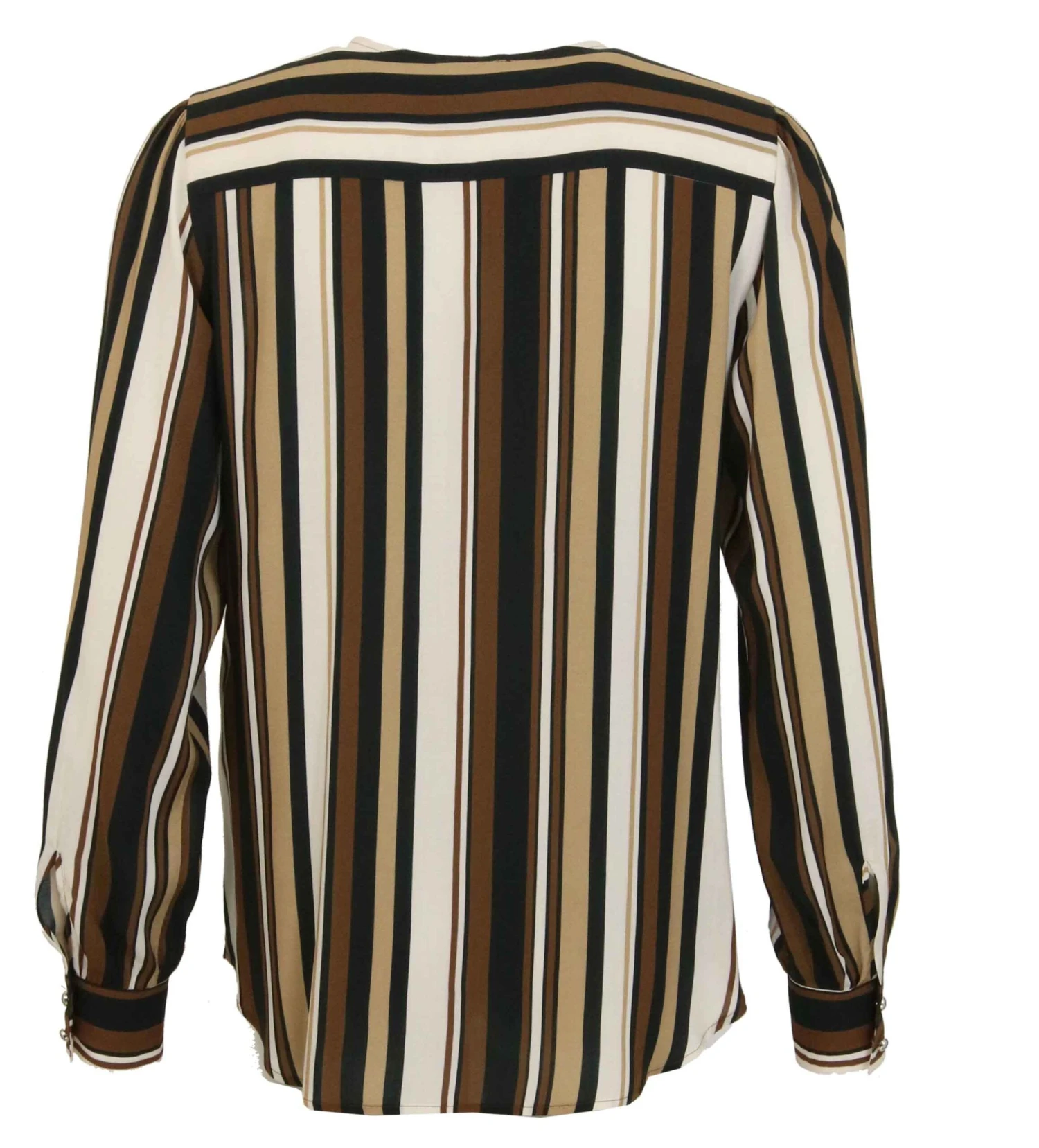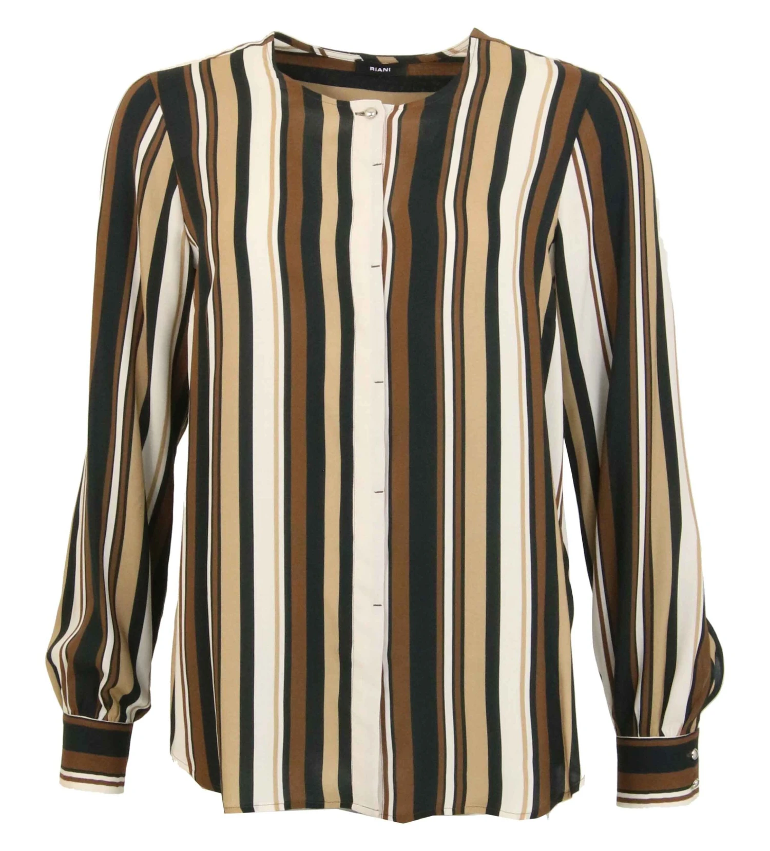 Een blouse van Riani in een strepen print met de kleuren camel, zwart, bruin en vanille. Deze blouse mag op 30 gaden worden gewassen.