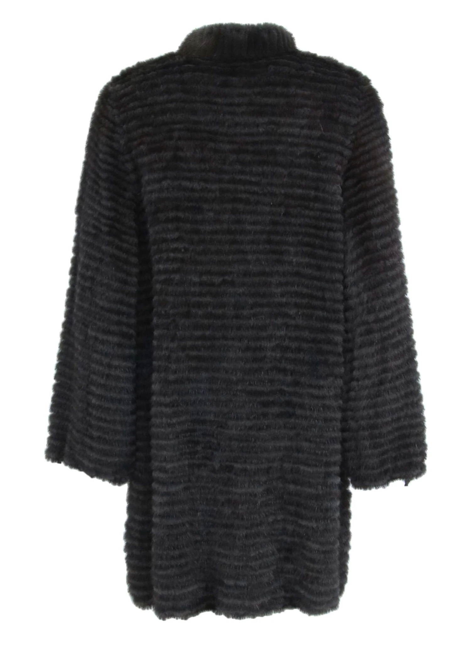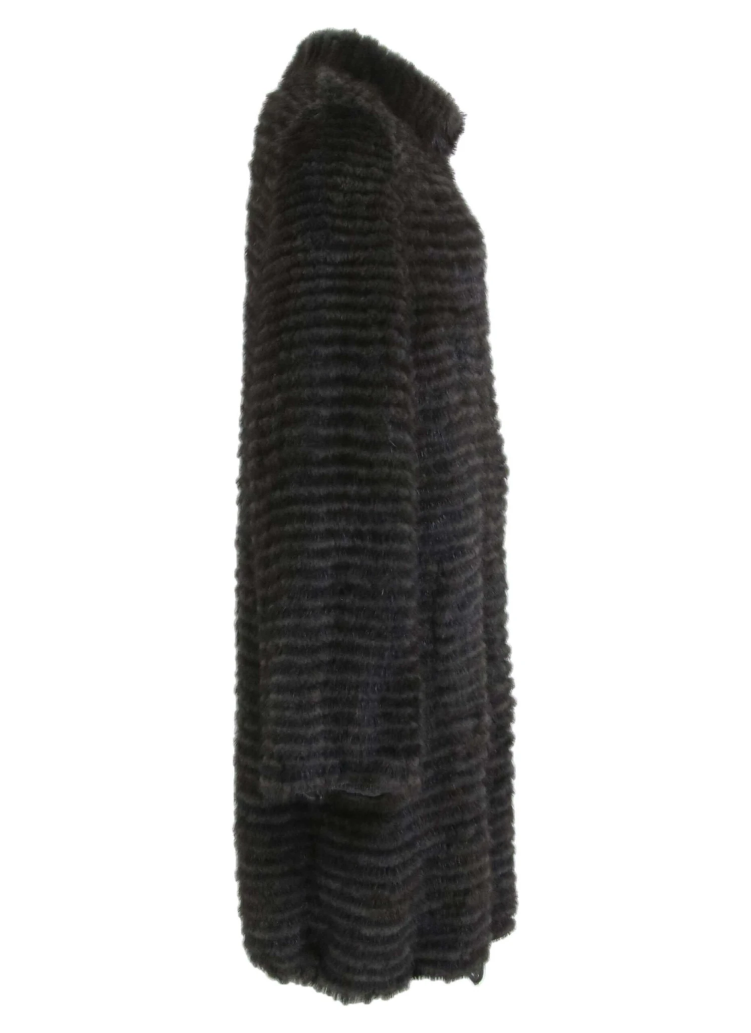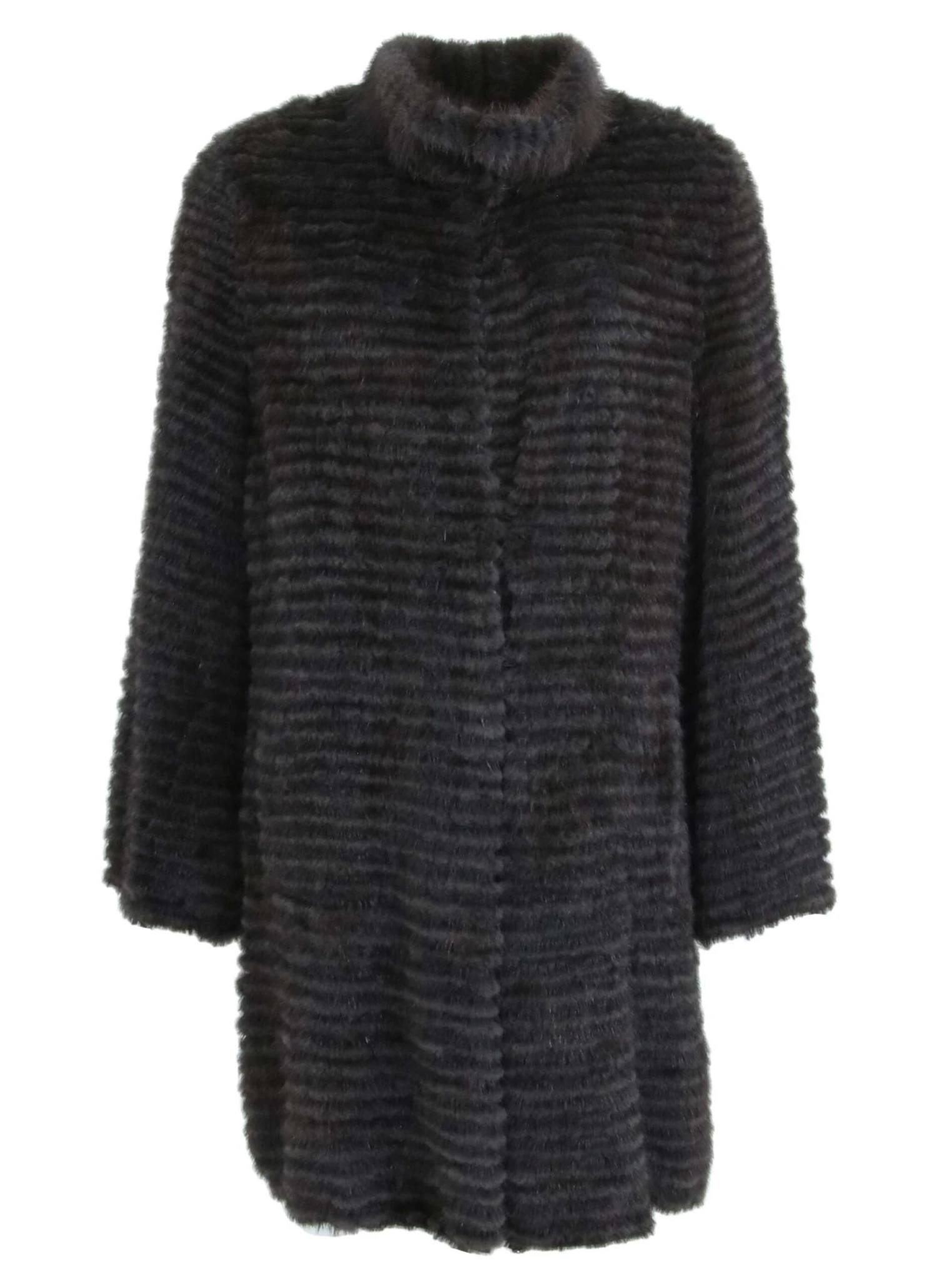 Een coat van nertsbont van Rosenberg & Lenhart. De coat is opgebouwd uit dunne reepjes bont wat een “ton sur ton” kleuren effect geeft. De sluitingen van de coat zijn door middel van bont haakjes en de coat kan hoog worden gesloten. De binnenvoering is van katoen met elasthan.