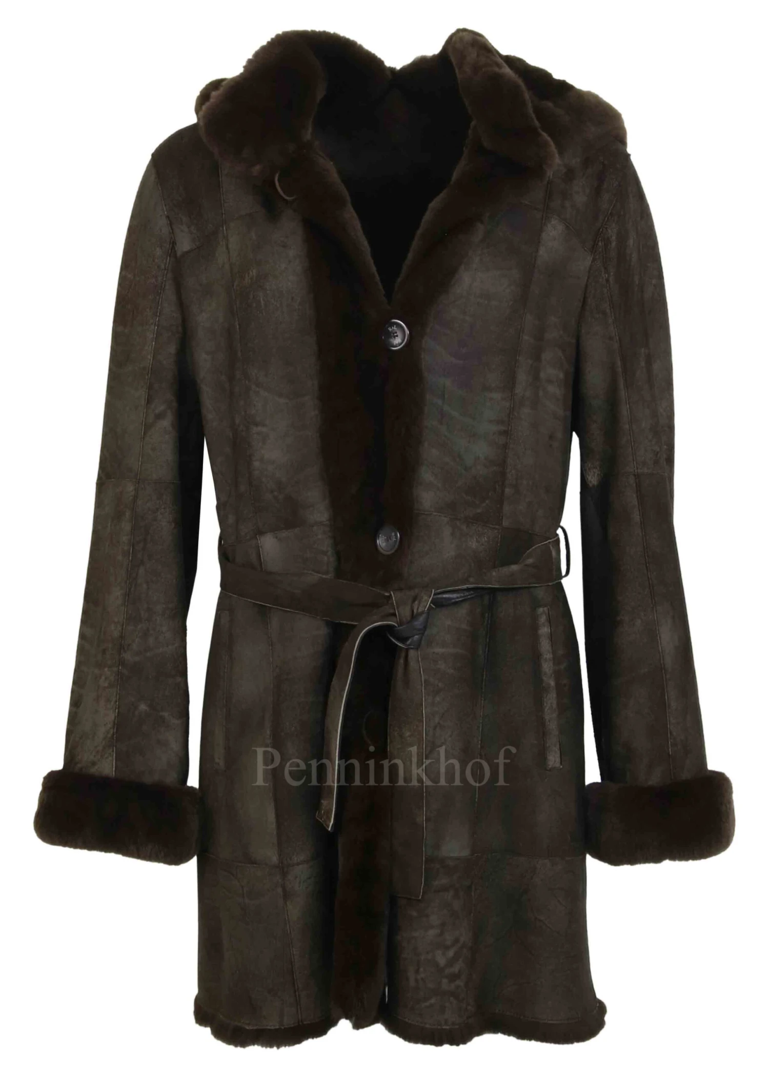 Een coat van Rosenberg & Lenhart in een gemêleerde donkerbruine kleur. Aan de buitenzijde van zacht nappa en aan de binnenzijde geheel met bont. De coat heeft een afneembare capuchon en heeft 3 knopen. De coat kan hoog worden gesloten.