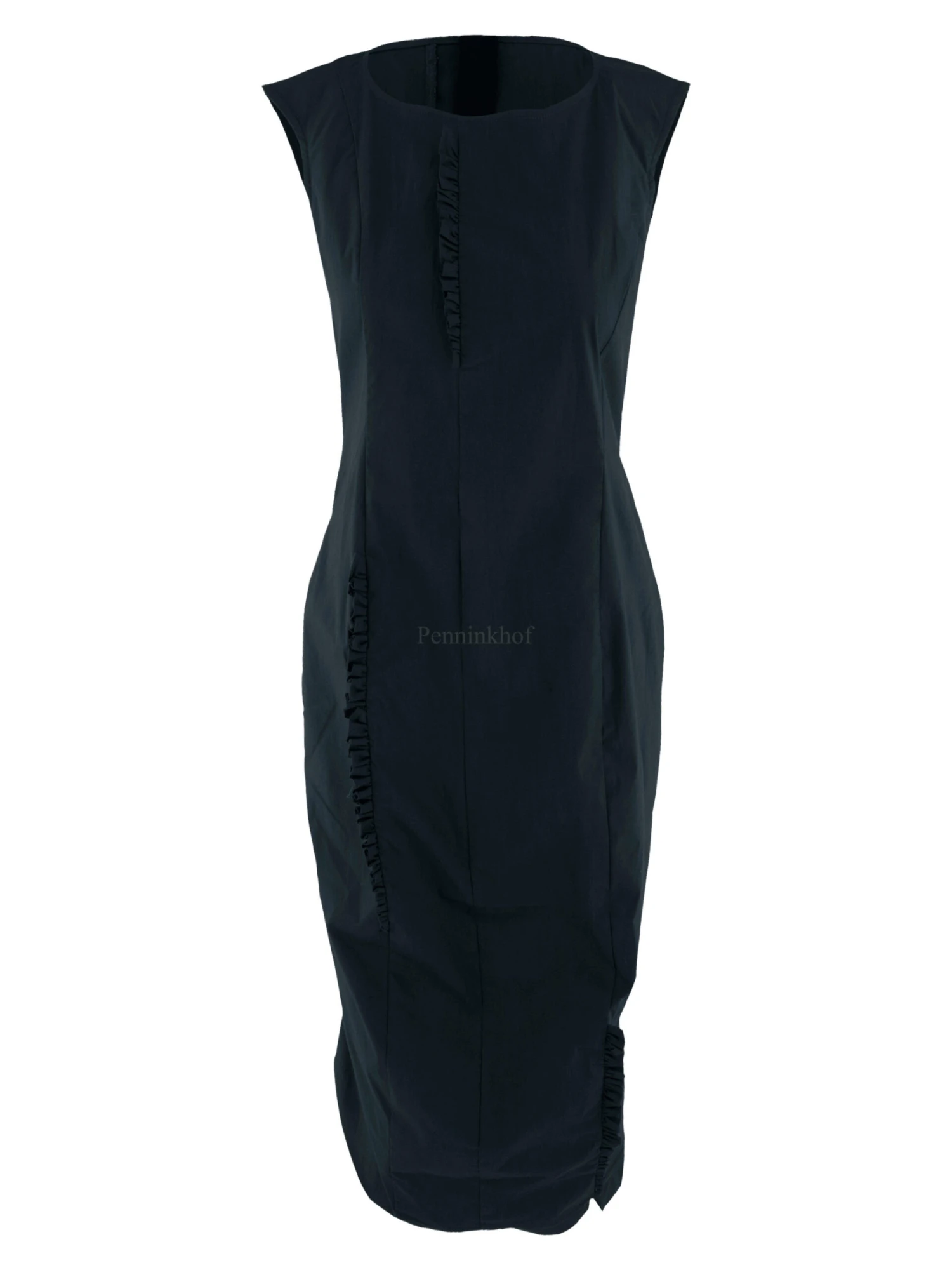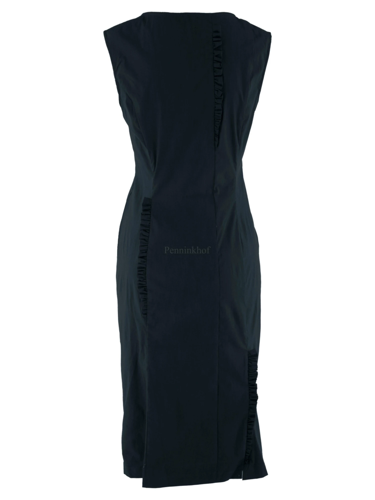 Een jurk van Rundholz black label in de kleur petrolblauw. Op meerdere plaatsen zijn langs de stiknaden aan de voor en achterkant gesmokte biezen.De jurk loopt taps toe en is ongevoerd. Deze jurk mag op 30 graden worden gewassen.