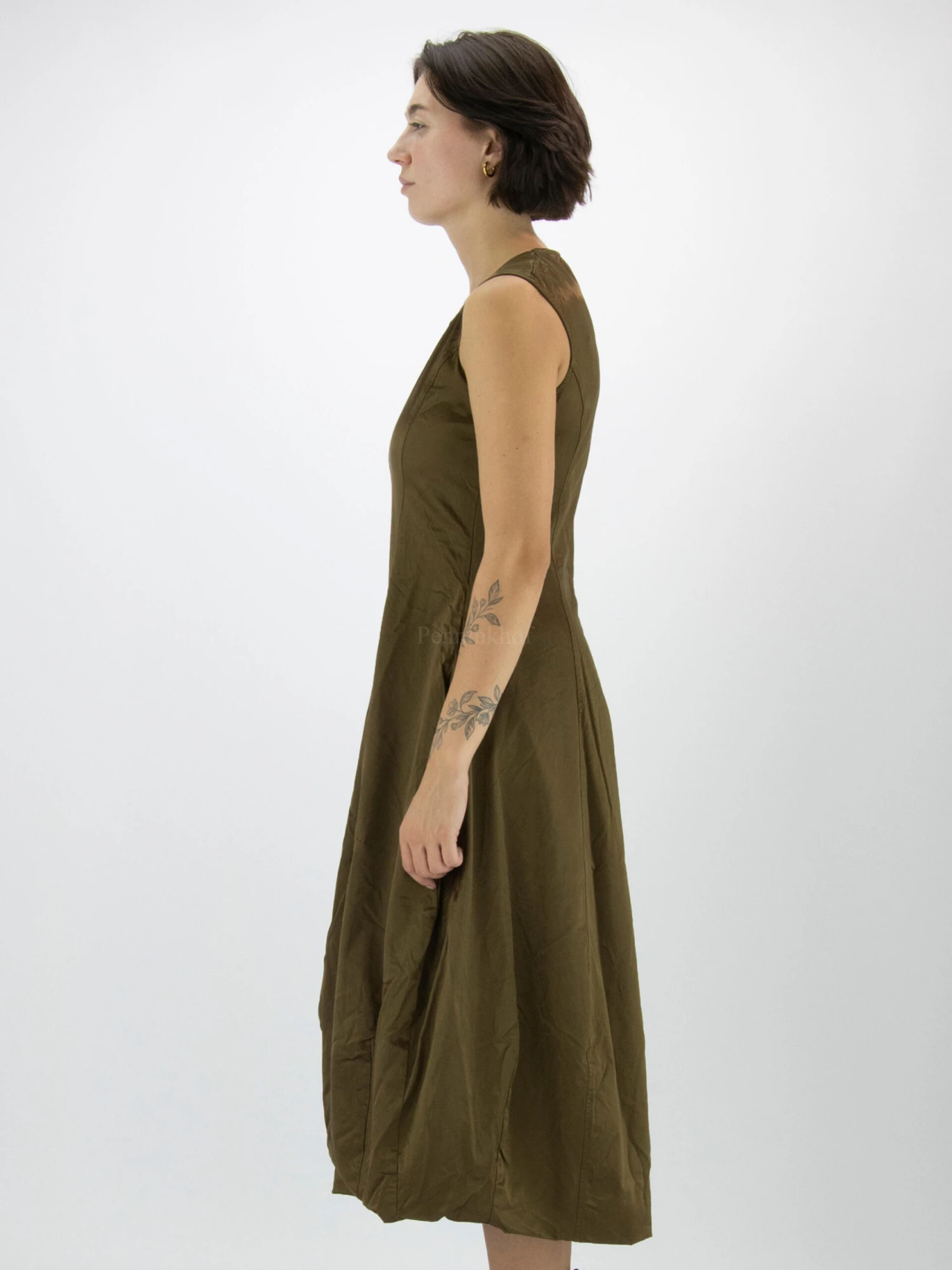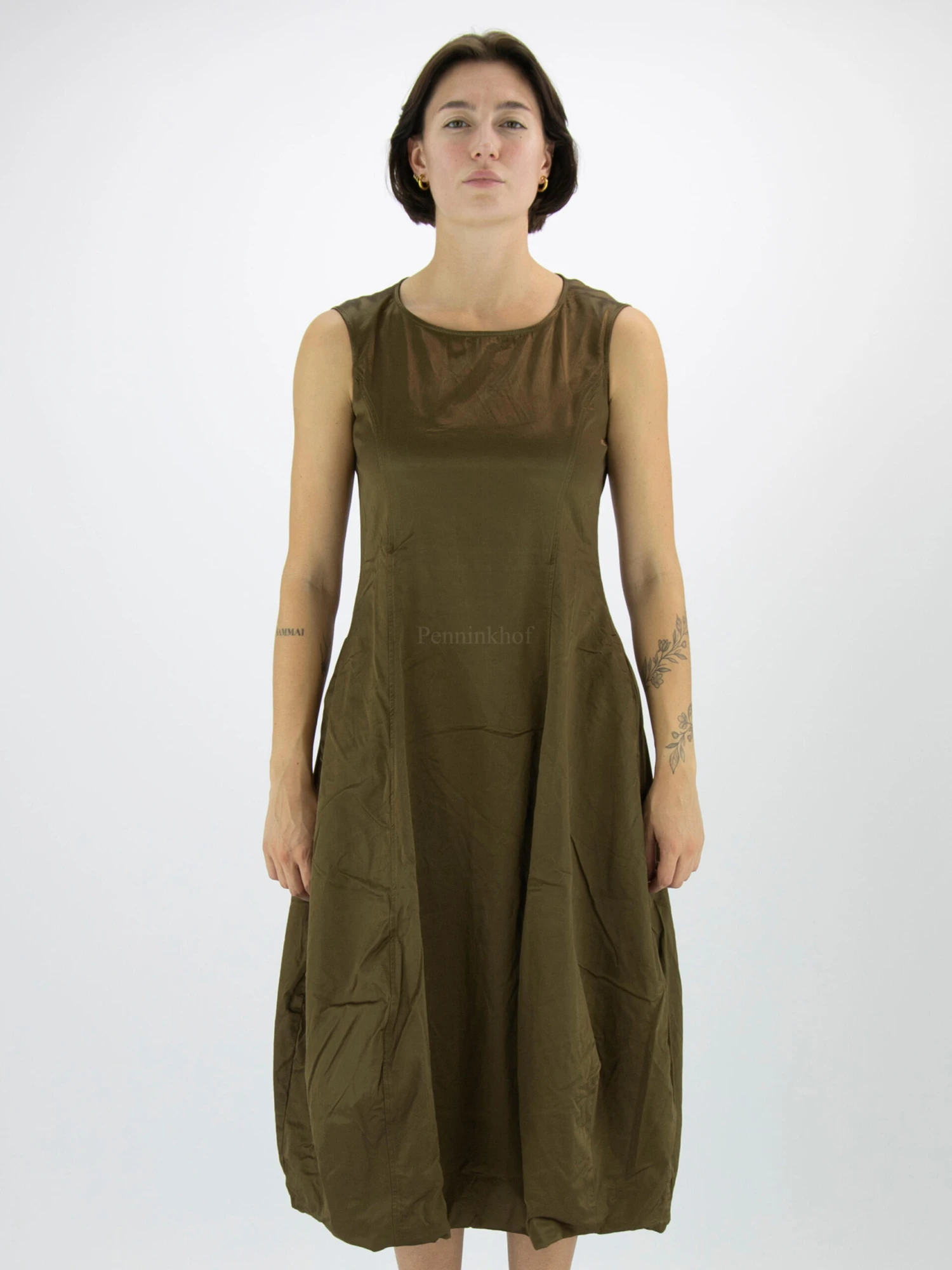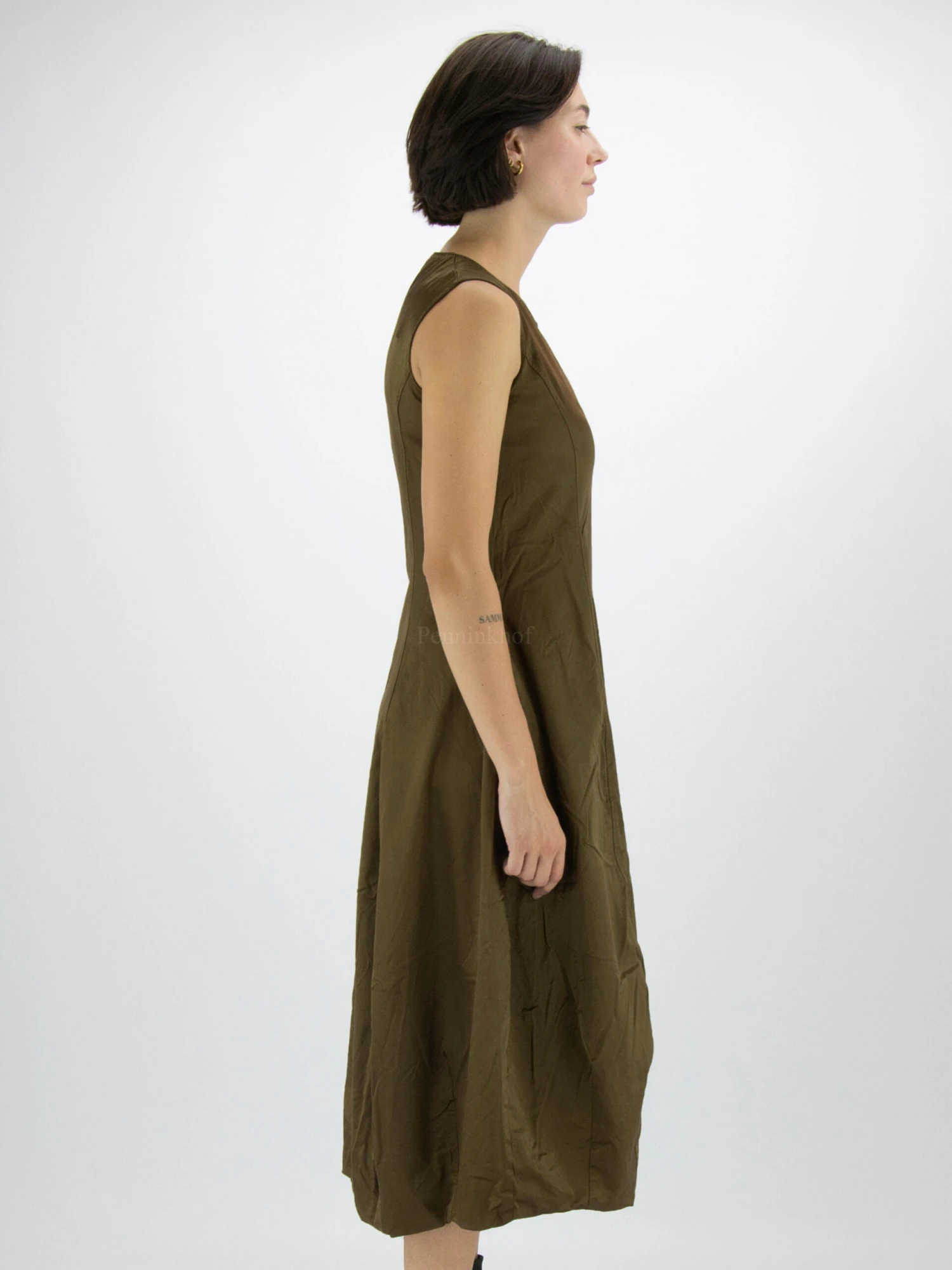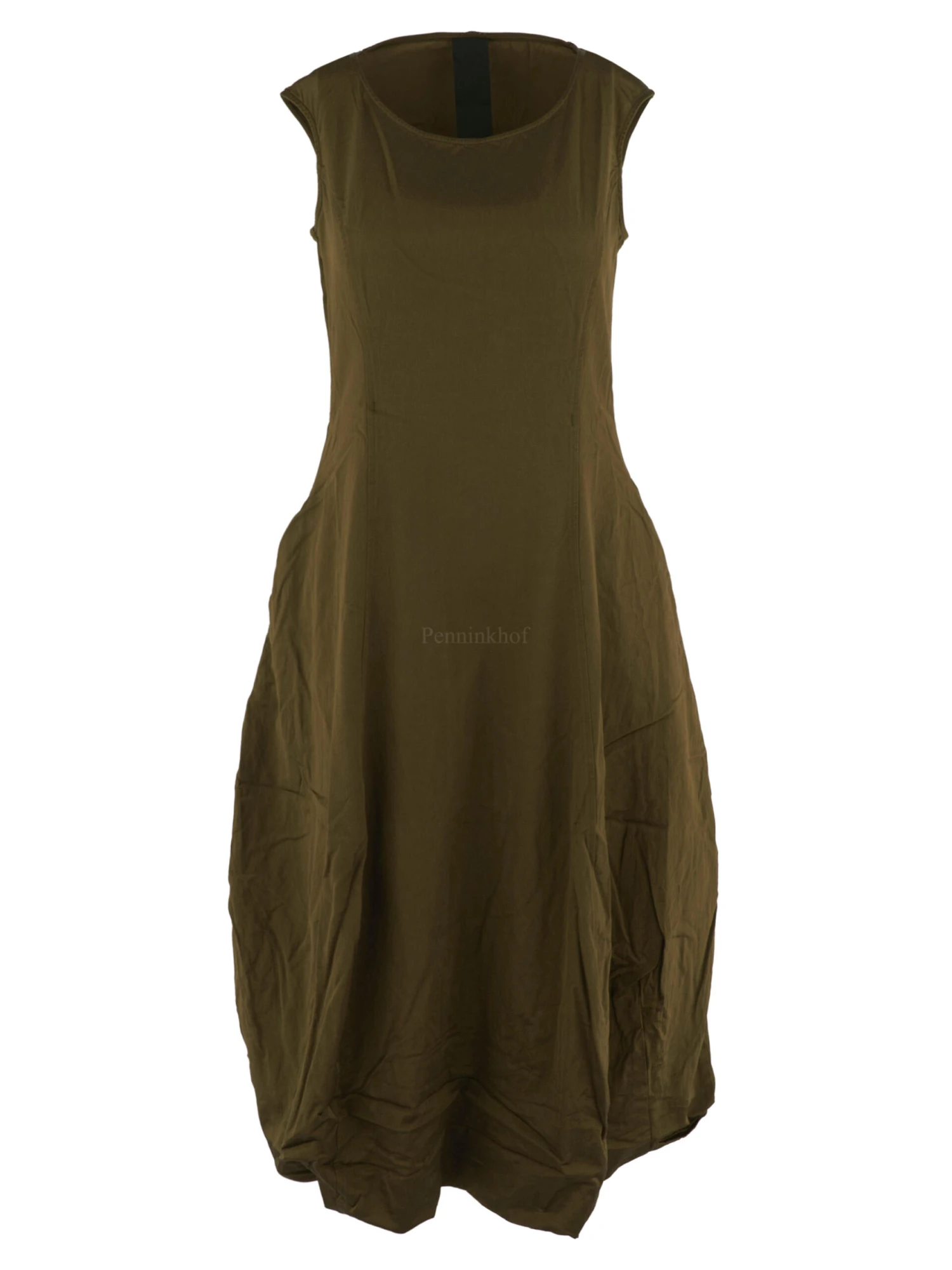 Een jurk van Rundholz in de kleur brons. De jurk is in een mat satijnen stof die aan de binnenkant is gevoerd. Ter hoogte van de taille zijn steekzakken.. De jurk heeft een ballon vorm en mag op koud water worden gewassen