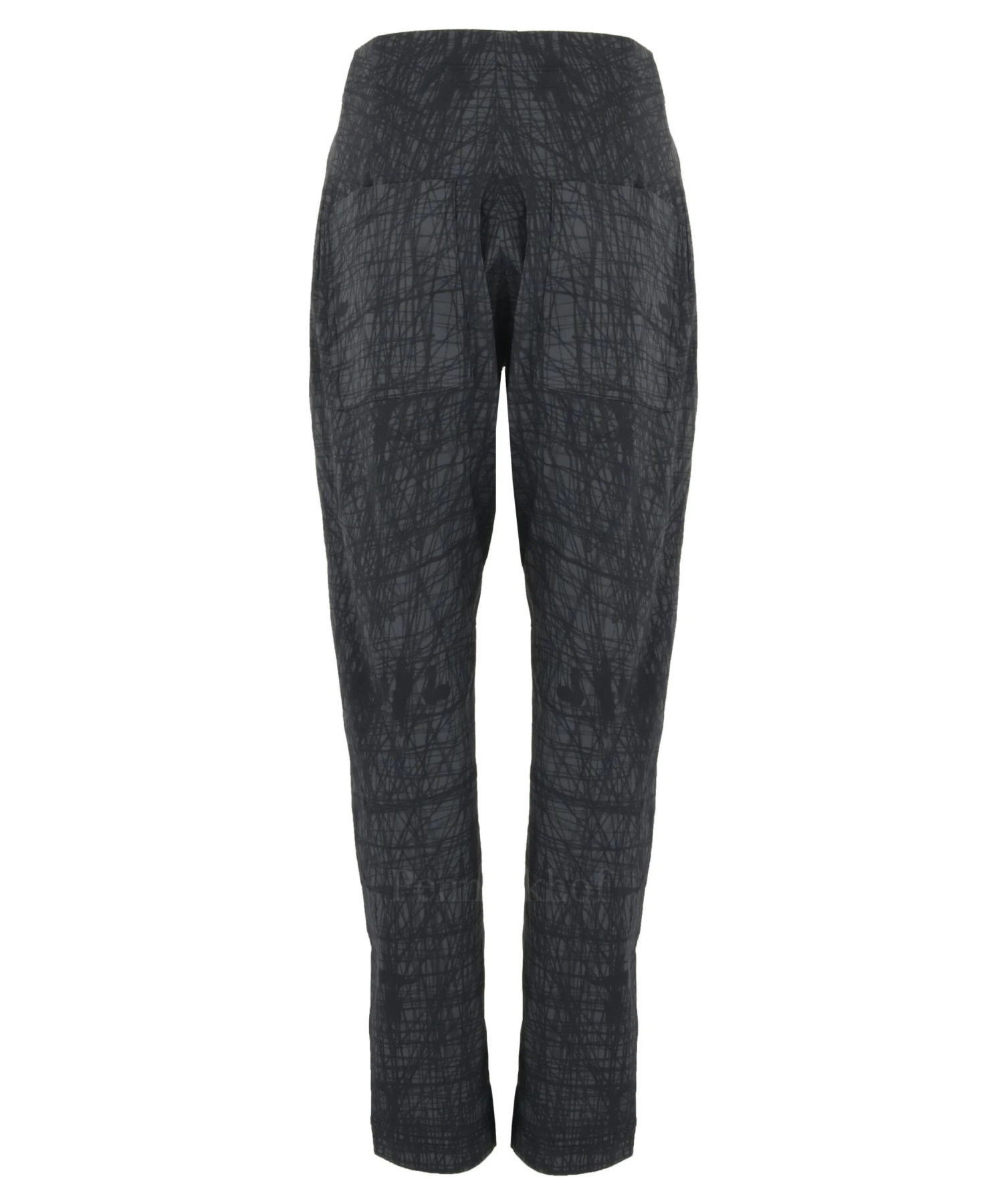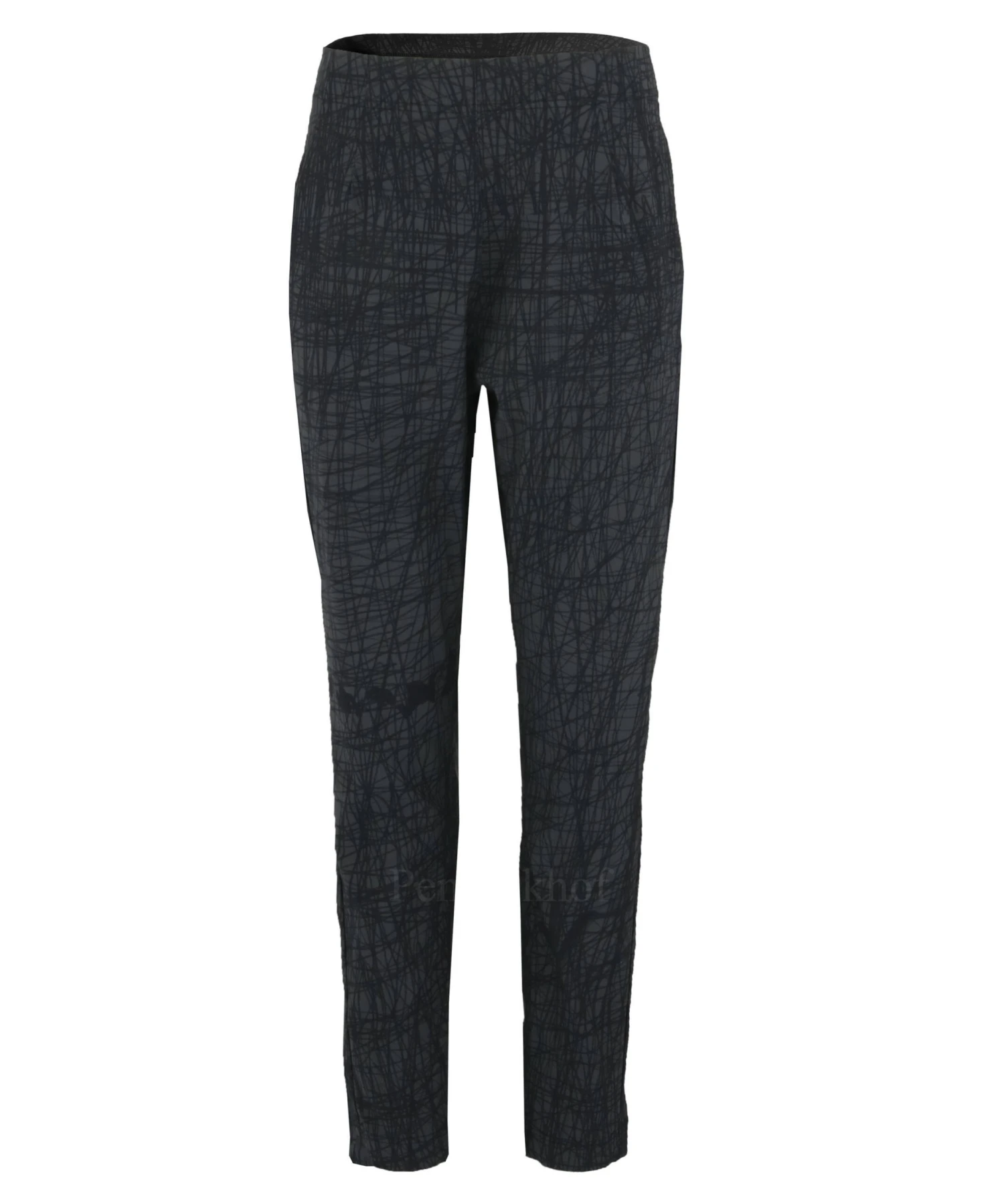 Een broek van Rundholz in een grafische print met de kleuren antraciet en zwart. In de taille is een elastieken band. De broek heeft steekzakken en mag op 30 graden worden gewassen.