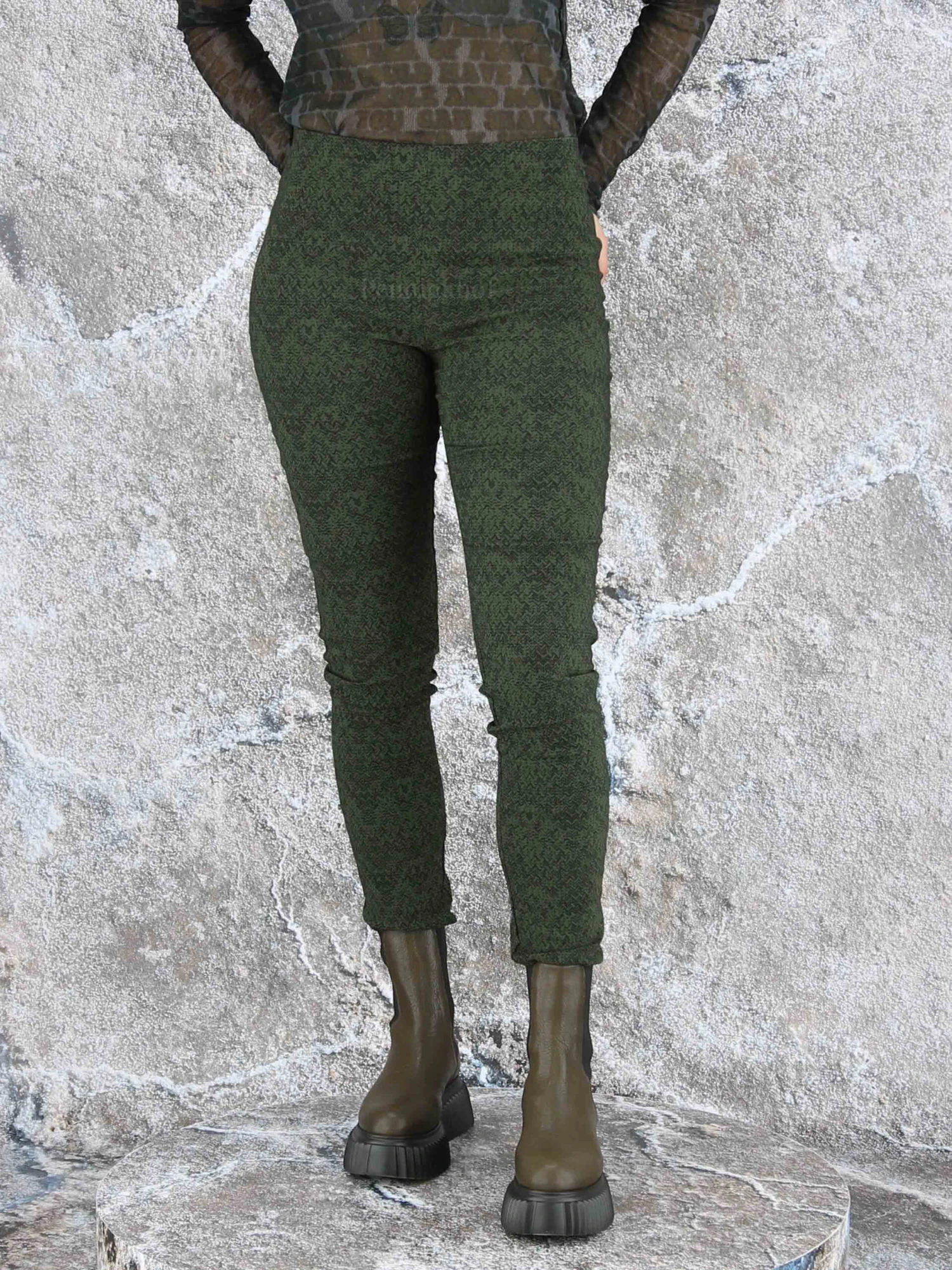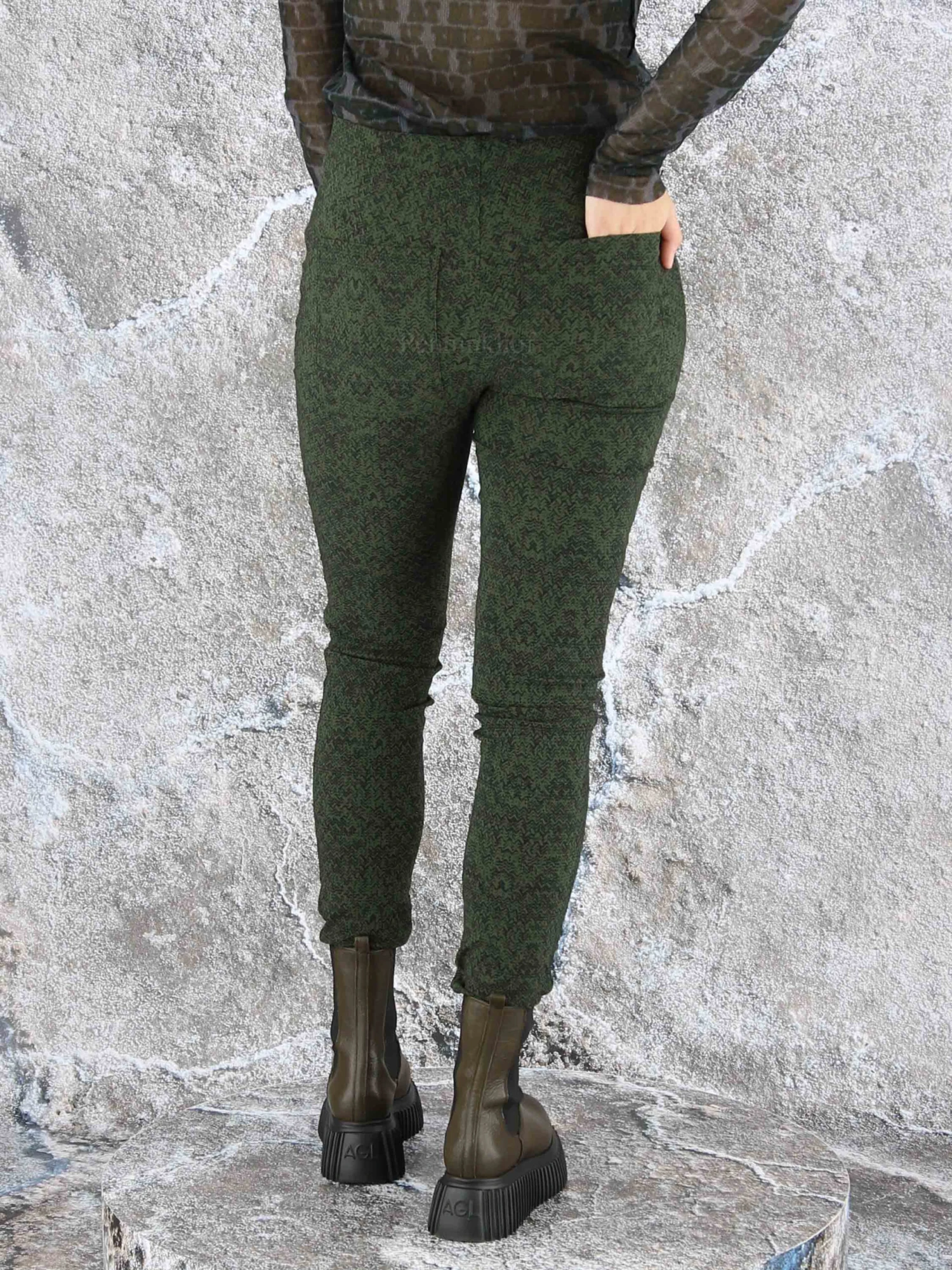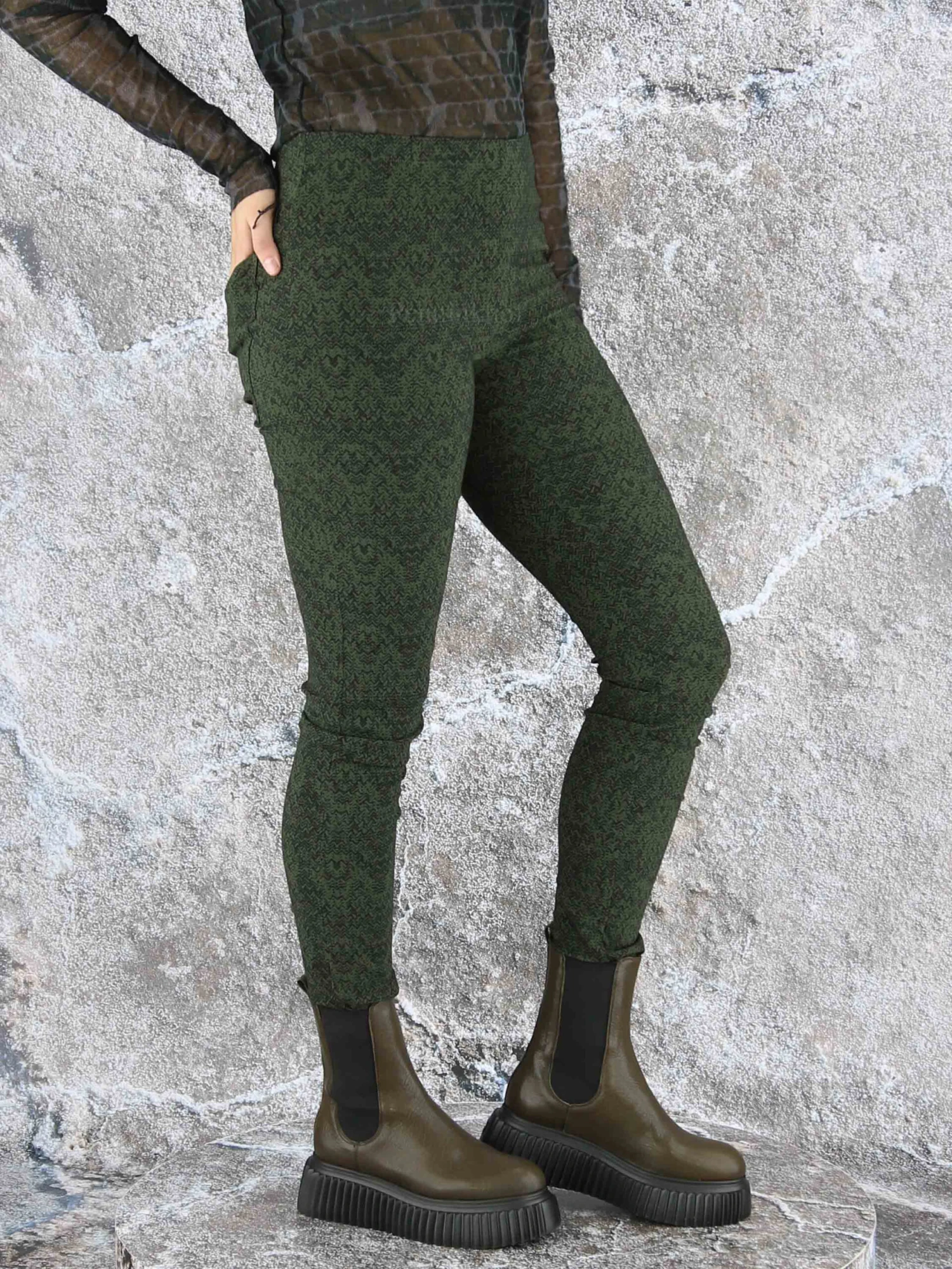 Een legging van Rundholz black label in een print met de kleuren groen en zwart. In de taille is een elastieken band. Deze legging mag op 30 graden worden gewassen.
