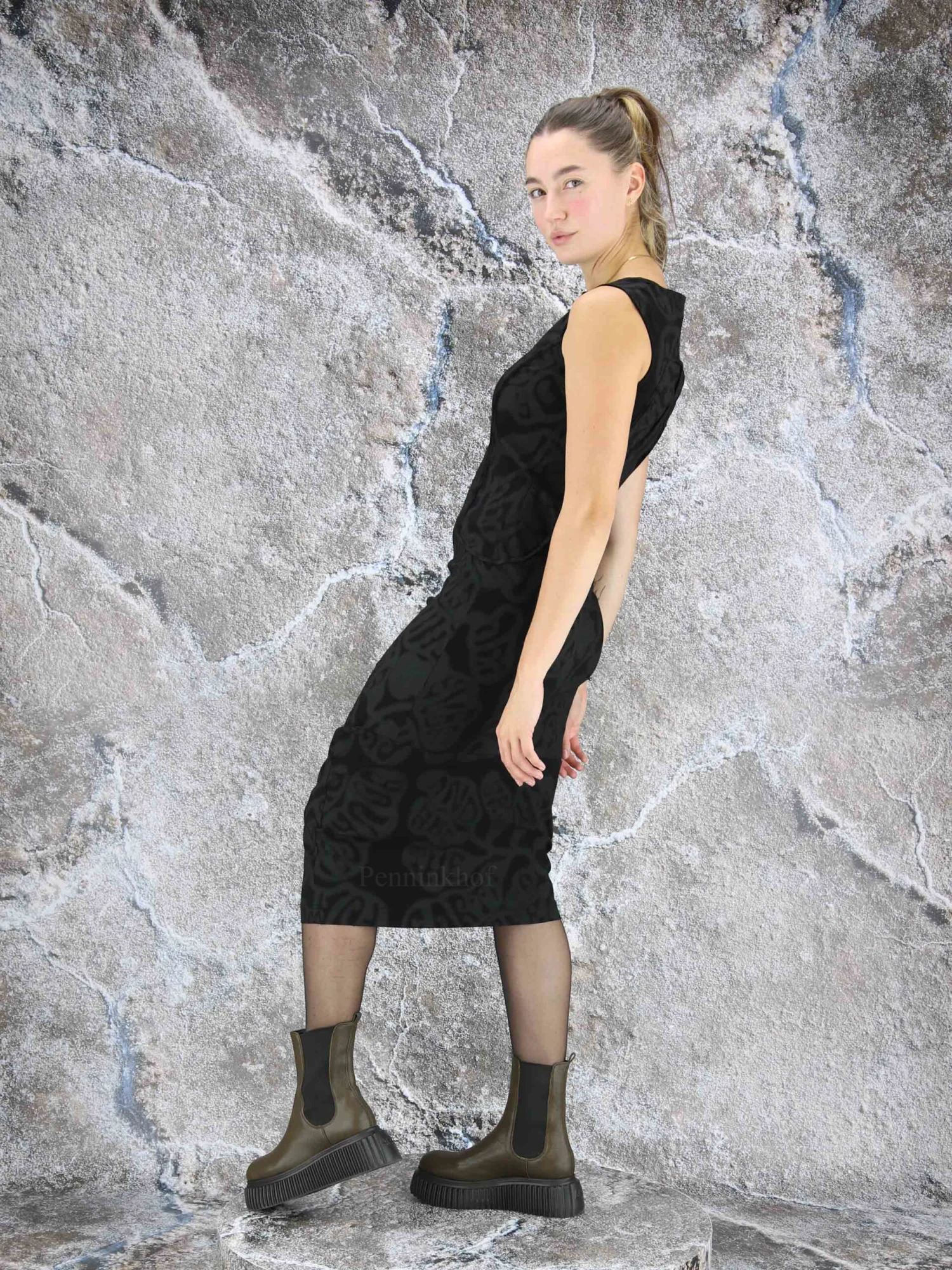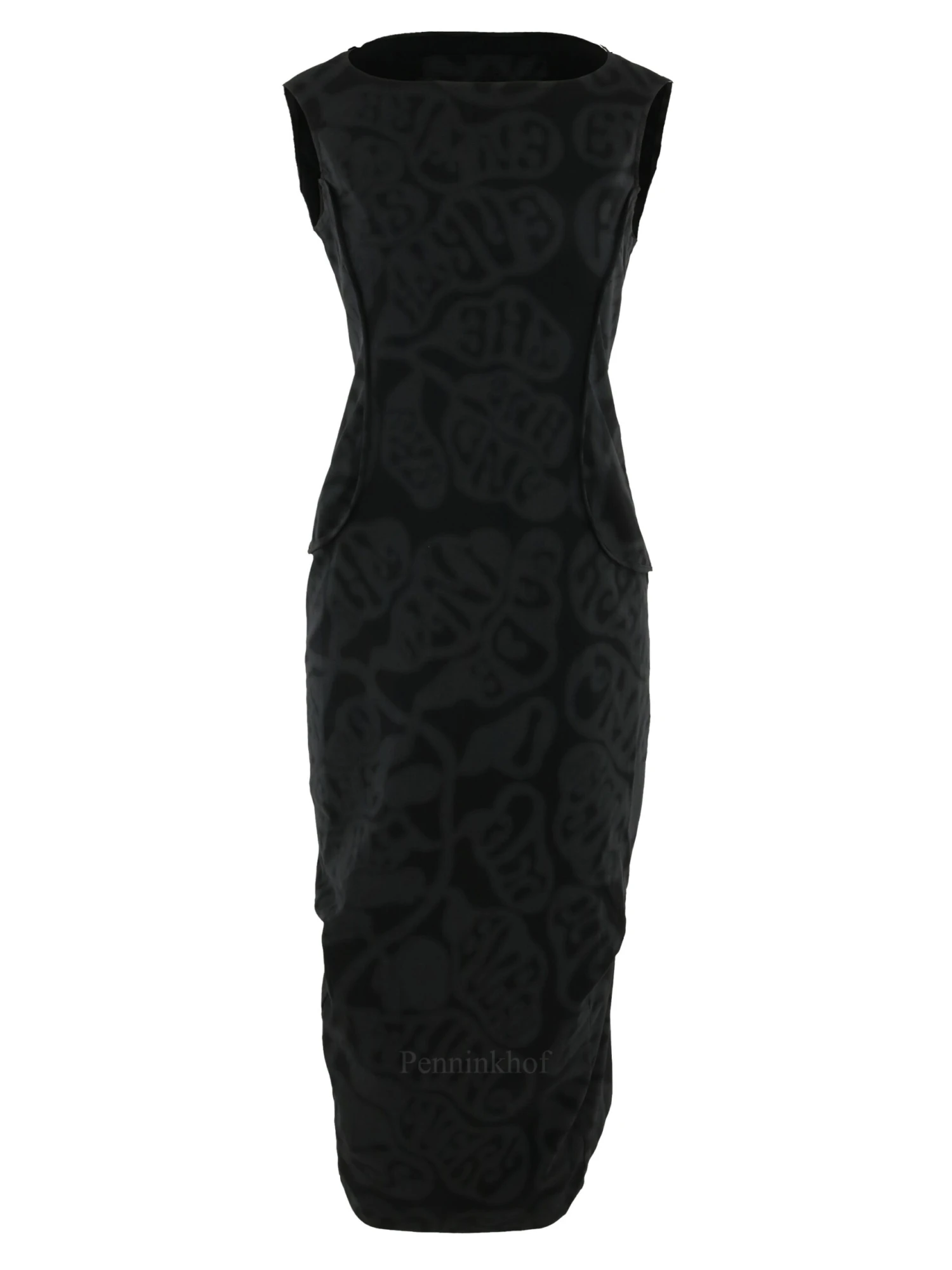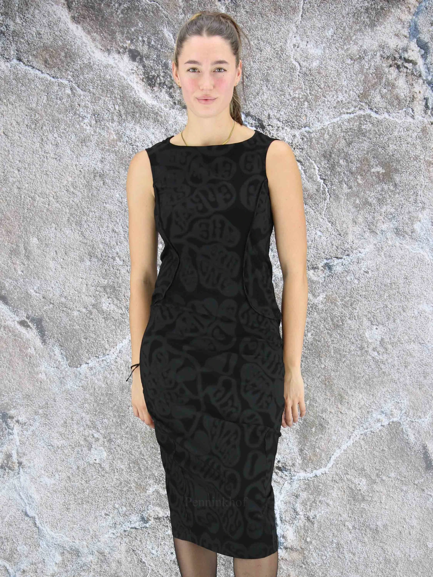 Een jurk van Rundholz black label in een barokprint met de kleuren grijs en zwart. De jurk heeft omgekeerde taillenaden. Deze jurk mag op 30 graden worden gewassen.