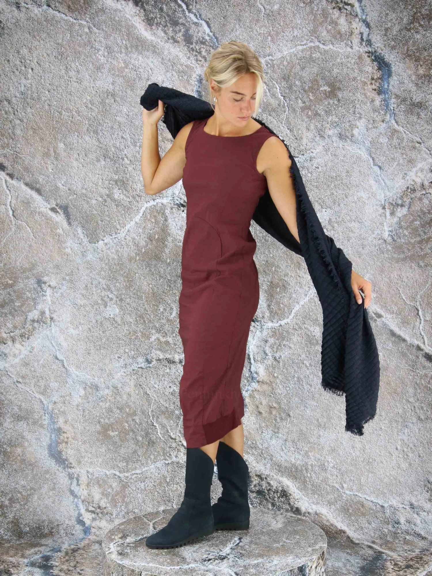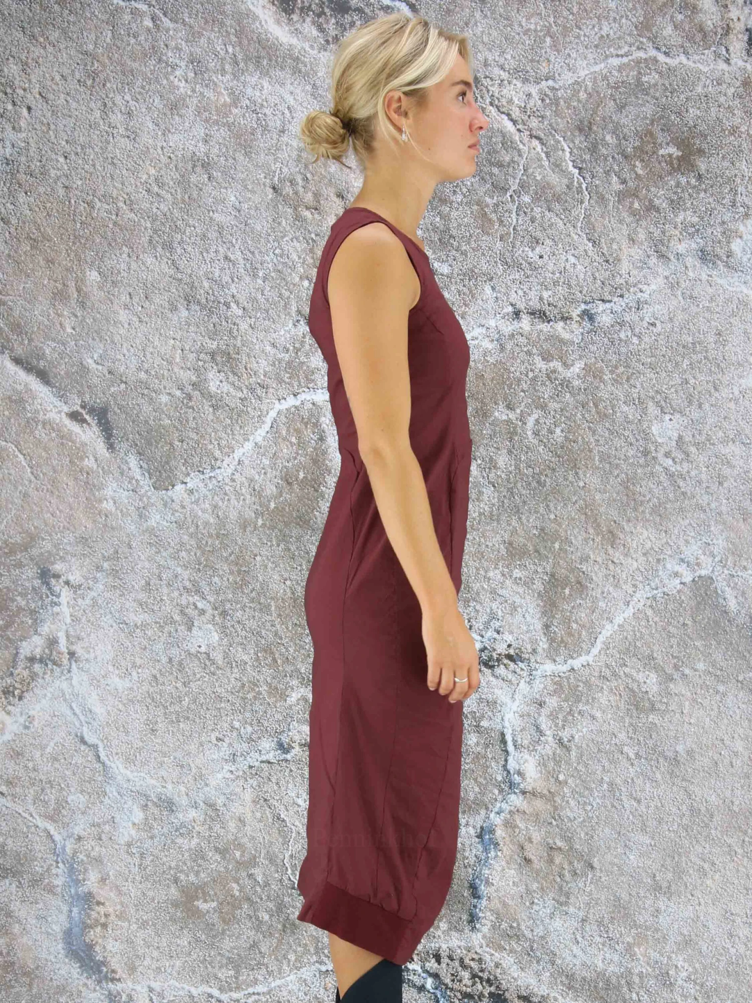 Een aangesloten jurk van Rundholz Black label in een bordeaux rode kleur. Aan de onderkant is aan beide zijkanten een brede fijn geribbelde tricot boord. Deze jurk mag op 30 graden worden gewassen.