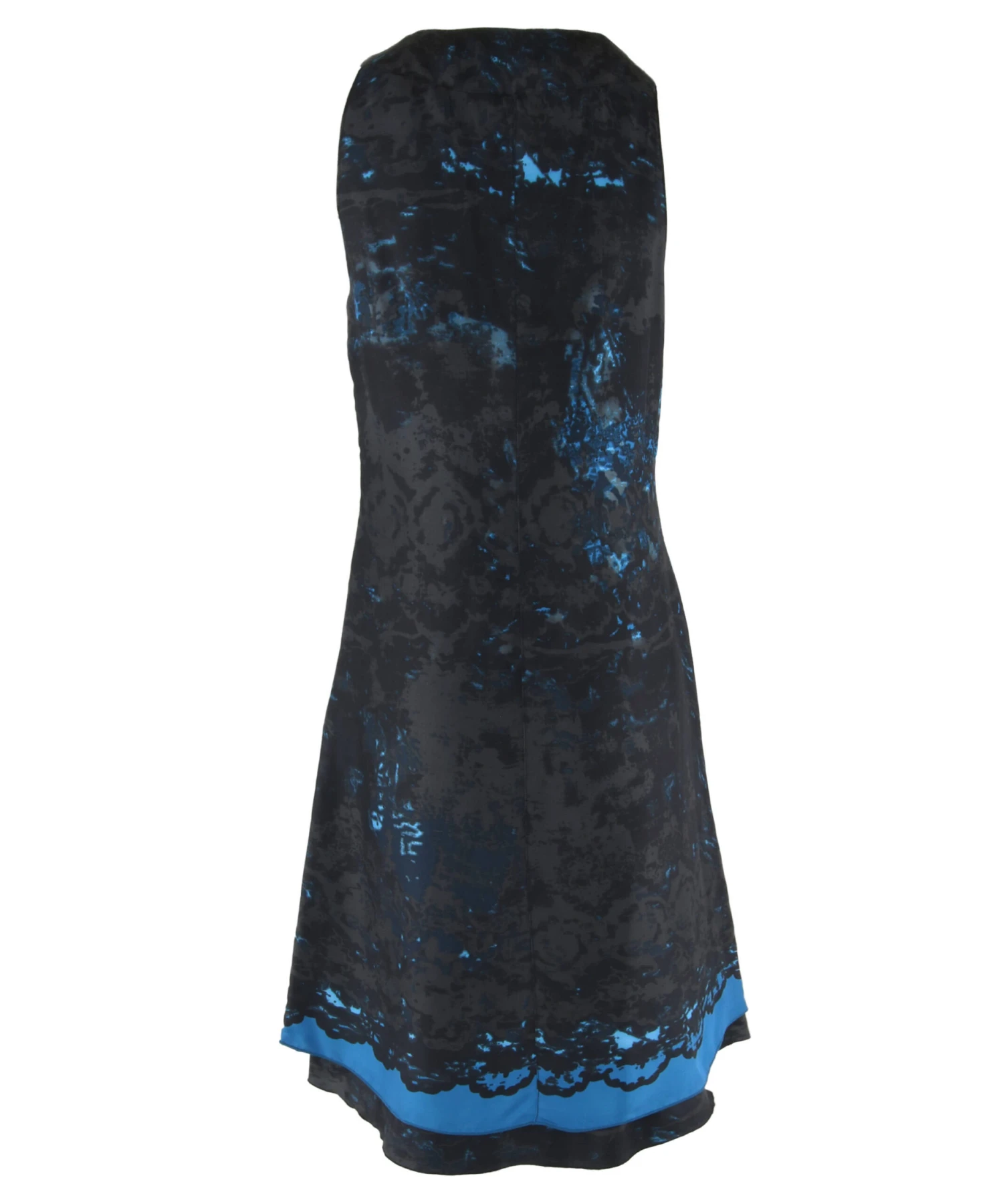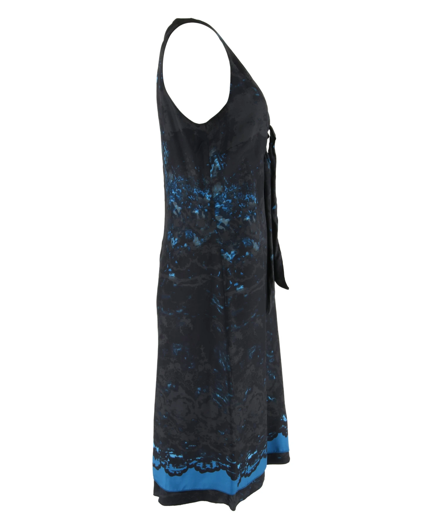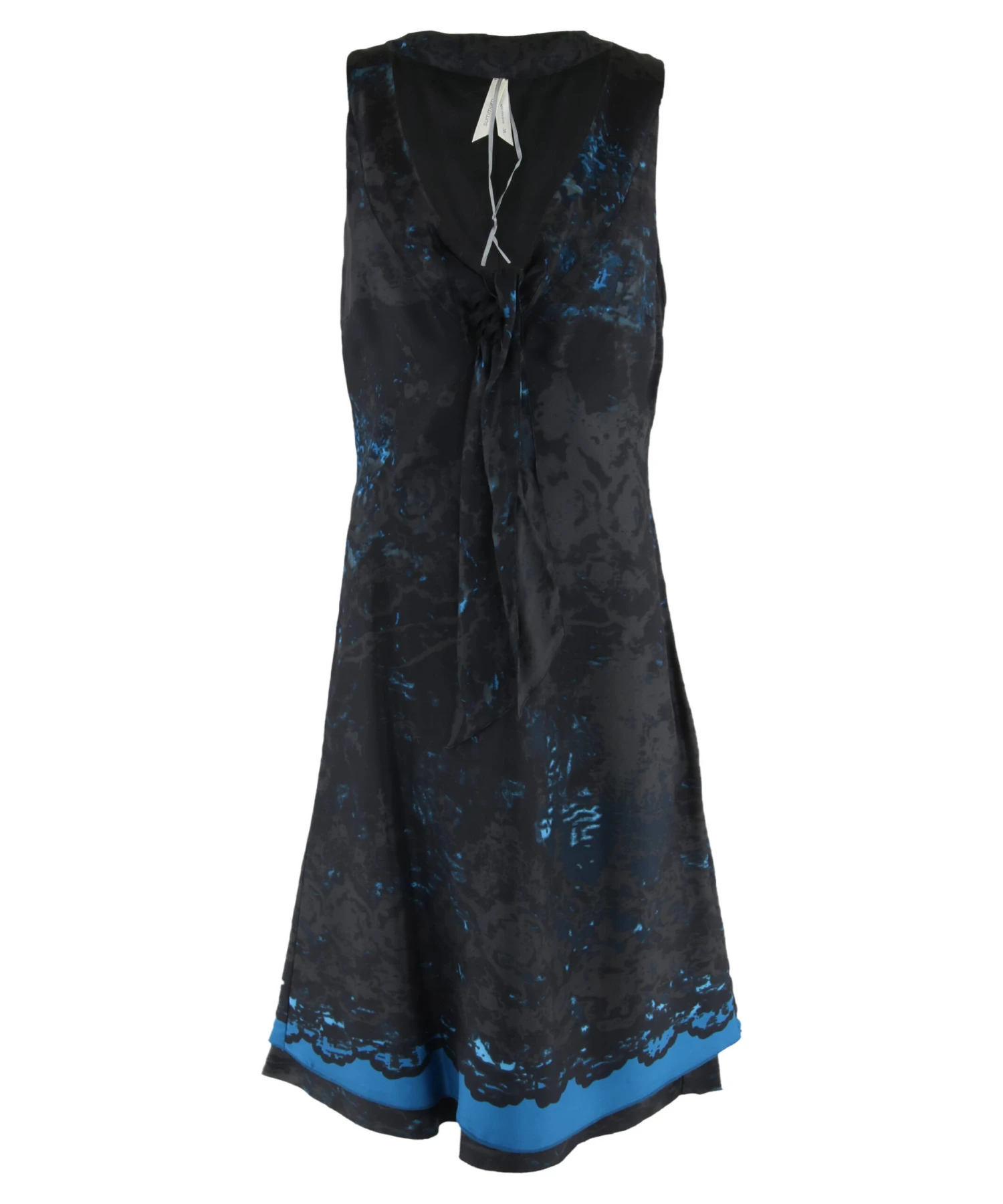 Een jurk van Summum in een grafische print met meerdere tinten antraciet en aqua blauw. Aan de onderzijde van de V – Hals zijn 2 decoratieve linten De jurk heeft een dubbele stof en mag op 30 graden worden gewassen.