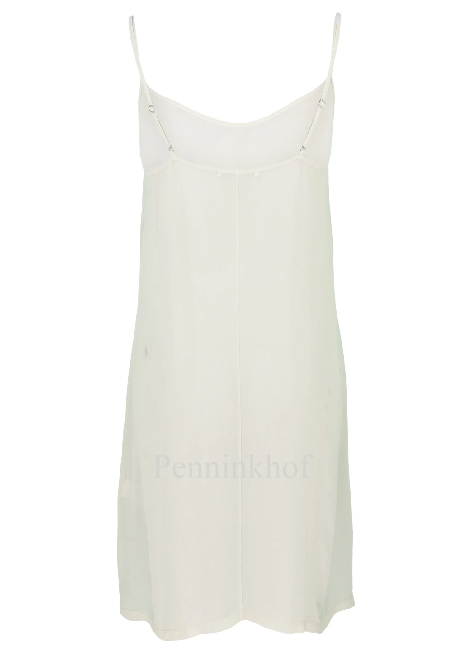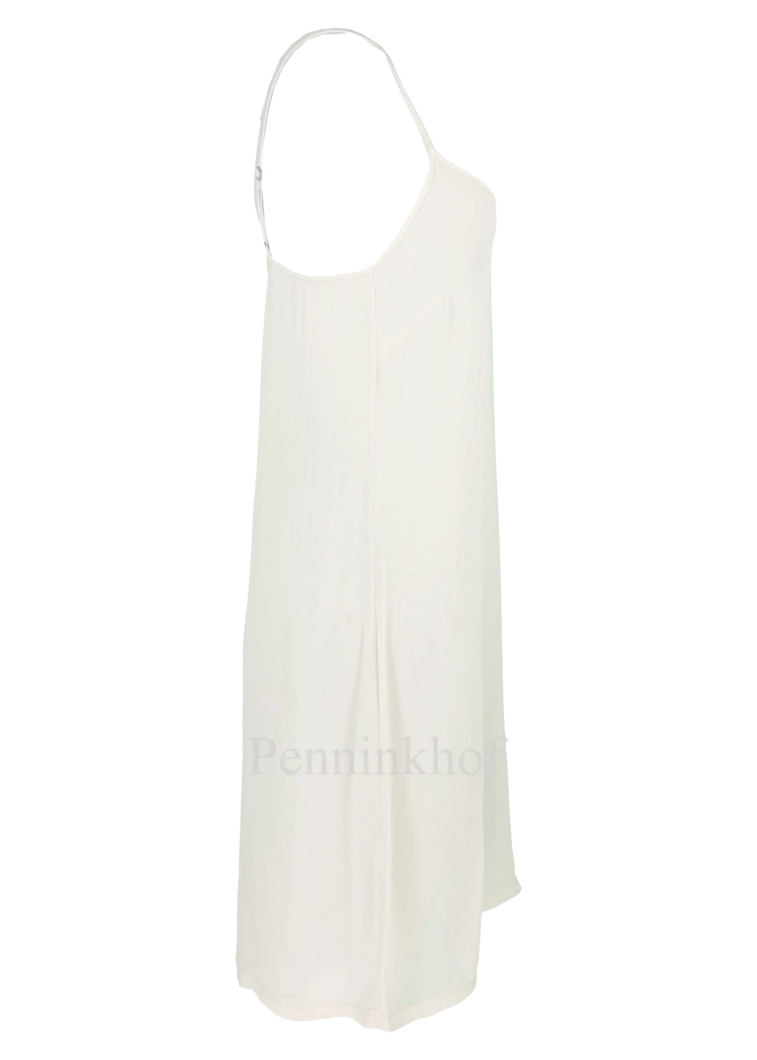 Een licht transparante (onder) jurk van Tandem in de kleur kit. De jurk heeft verstelbare spaghetti bandjes. Deze jurk mag op 30 graden worden gewassen.