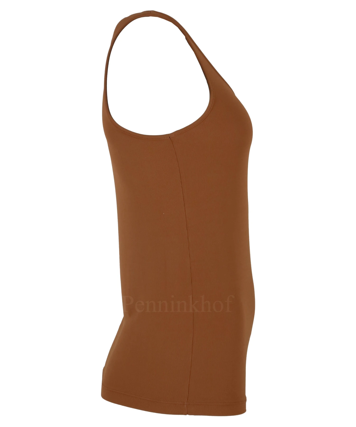 Een top van Tandem in de kleur cognac. De stof is fijn geribbeld. De top heeft een ronde hals en mag op 30 graden worden gewassen.